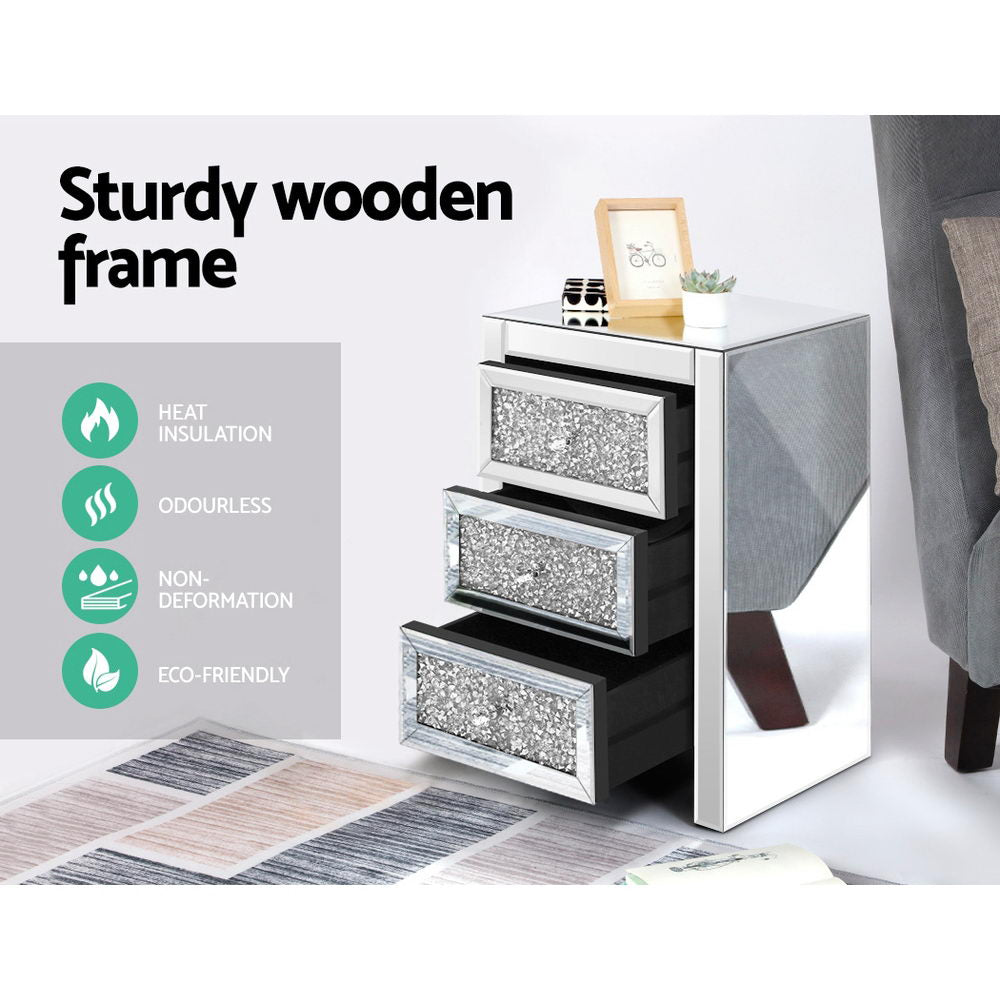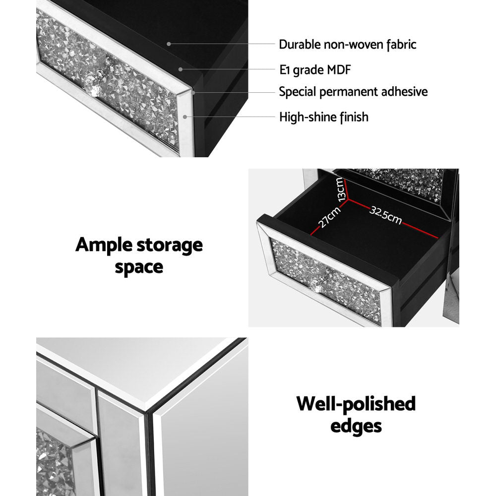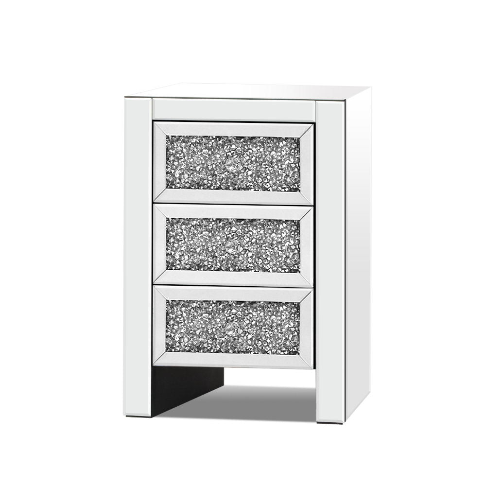Enjoy all the glitz and glamour that comes with our Diamond Mirror Bedside Table. Cladded with brilliant bevelled mirror glass and a durable E1-grade MDF frame, the elegant bedside table is simply stunning from any angle that reflects its mirrored beauty. Place it in your bedroom or even in the living room, study or any other room that needs some extra storage with some pizzazz. Wherever you place it, the mirrored effect gives the room a larger-than-life look of space and size. The three drawers offer ample storage space and have well-fitting tenon runners for smooth operation. Not least, the unique drawer fronts and crystal glass effect knob handles also add some scintillating touches to the drawers with an exquisite appeal. Easy to maintain and clean, our bedside table is all about grandeur living made simple.
