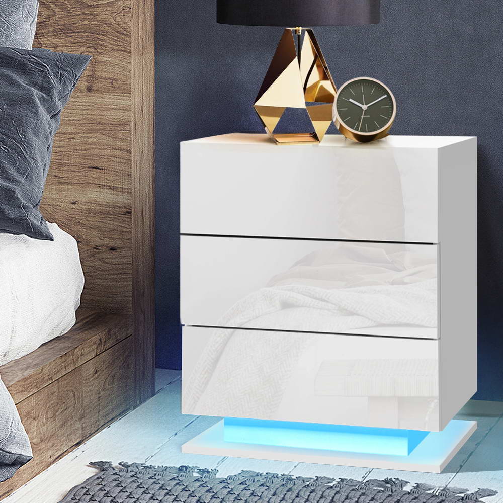 Tired of fumbling in the dark for a light switch in the middle of the night? With our LED Bedside Table, your problems are solved. The bedside table comes with built-in LED lighting that can be customised into 16 different colours and 4 different effects to suit your preference. Not only will it create a beautiful ambience, it will also save you from buying extra bedside lamps or nightlights. Three deep drawers sliding on smooth coated runners provide ample storage space. Better still, the handle-free design gives it a modern vibe that stands out from the mundane. Constructed from quality particle board and MDF with melamine finish and high-gloss UV front, the bedside table is durable and easy to maintain. And it will be the perfect addition to your modern bedroom with its contemporary and linear design. Or you can even keep one in the living room to wow all your houseguests.