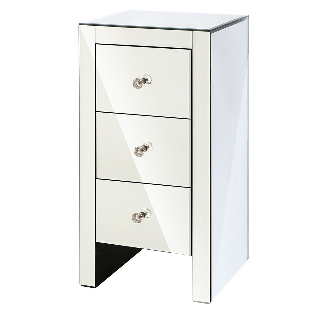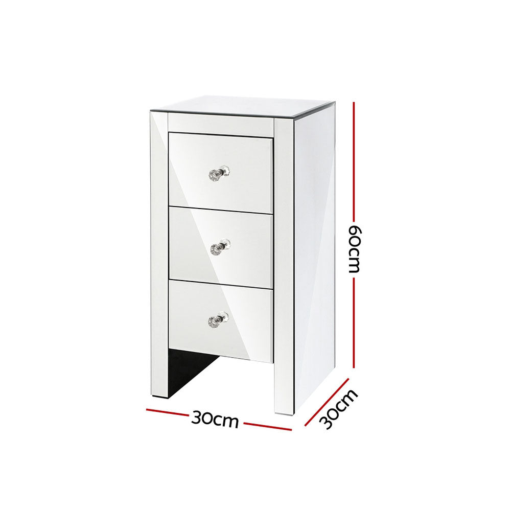 Enjoy all the glitz and glamour that comes with the Quenn Bedside Drawers. Cladded with bevelled mirror glass and a durable E1 grade MDF board frame, the elegant drawers are simply stunning from any angle that reflects its mirrored beauty. Plus, the effect also gives your room a larger-than-life look of space and size. The three drawers offer ample storage space and are fitted with coated metal sliders for smooth operation. Not least, the crystal glass effect handles also add a scintillating touch to the drawers with an exquisite appeal. Easy to maintain and clean, our bedside drawers is all about grandeur living made simple.