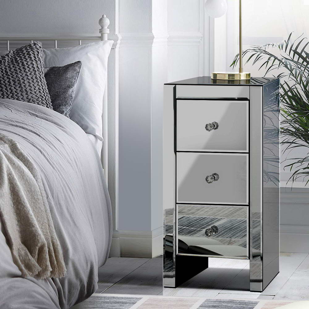 Enjoy all the glitz and glamour that comes with the Quenn Bedside Drawers. Cladded with bevelled mirror glass and a durable E1 grade MDF board frame, the elegant drawers are simply stunning from any angle that reflects its mirrored beauty. Plus, the effect also gives your room a larger-than-life look of space and size. The three drawers offer ample storage space and are fitted with coated metal sliders for smooth operation. Not least, the crystal glass effect handles also add a scintillating touch to the drawers with an exquisite appeal. Easy to maintain and clean, our bedside drawers is all about grandeur living made simple.