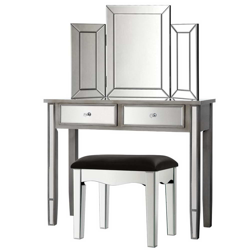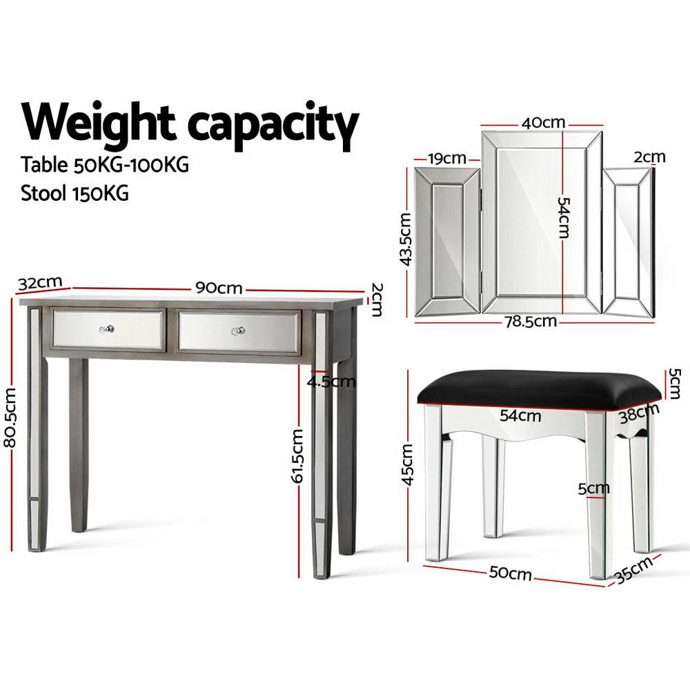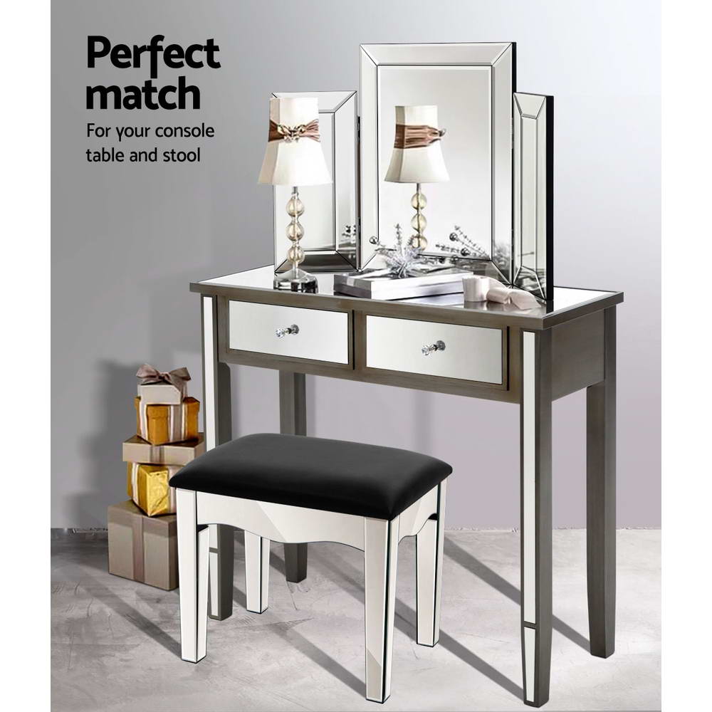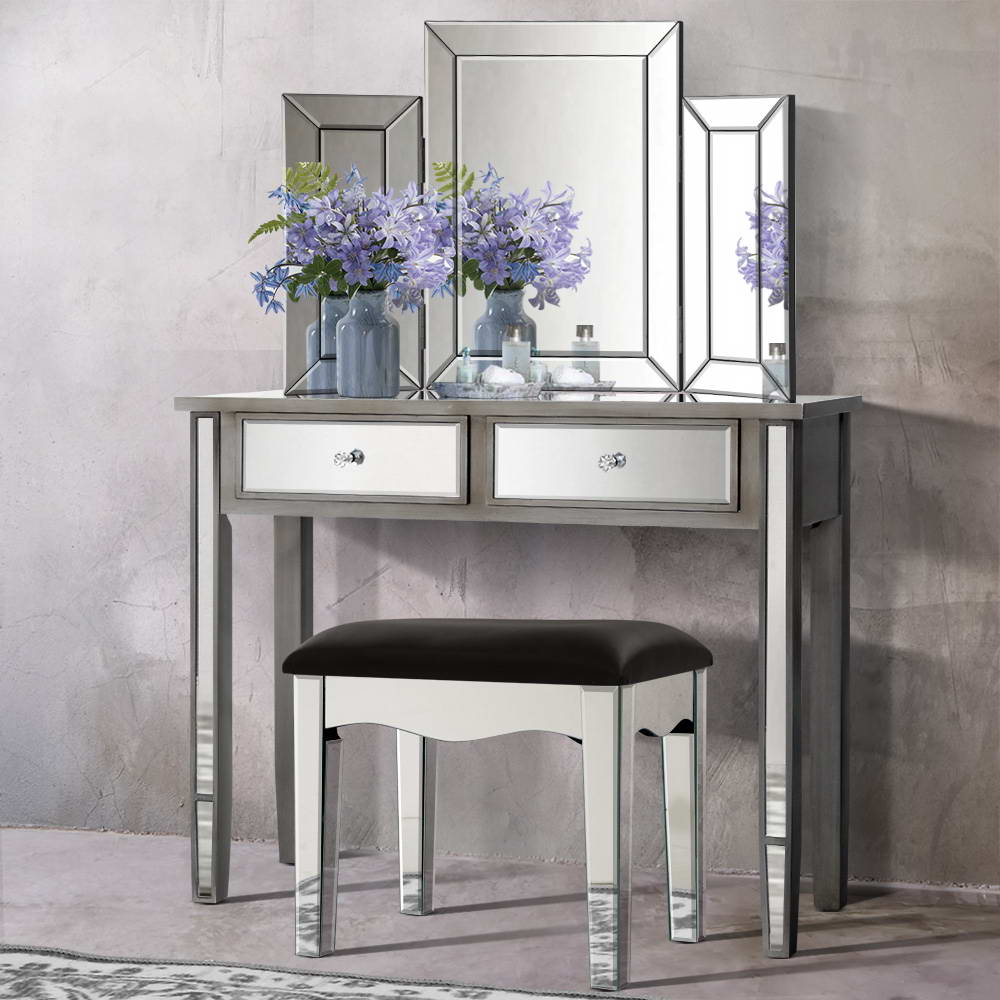Enjoy all the glitz and glamour that comes with our Mirror Dressing Table set that comprises a table, mirror and stool. Cladded with bevelled mirror glass and a durable E1 grade MDF board frame, the elegant dressing table set is simply stunning from any angle that reflects its mirrored beauty. And the mirrored effect gives your bedroom a larger-than-life look of space and size. The large tabletop is 32cm wide and there are two drawers fitted with smooth runners, so you have ample space to display or store your items. The crystal glass effect handles also add a scintillating touch to the drawers with an exquisite appeal. The folding mirror is sturdy, at 2cm thick with safety brackets included. The side mirrors fold 180° so that you can admire your reflection from any angle or completely close the mirror when not in use. The stool is upholstered in premium PU leather and padded with thick foam for luxurious comfort. Easy to maintain and clean, our dressing table is all about grandeur living made simple.