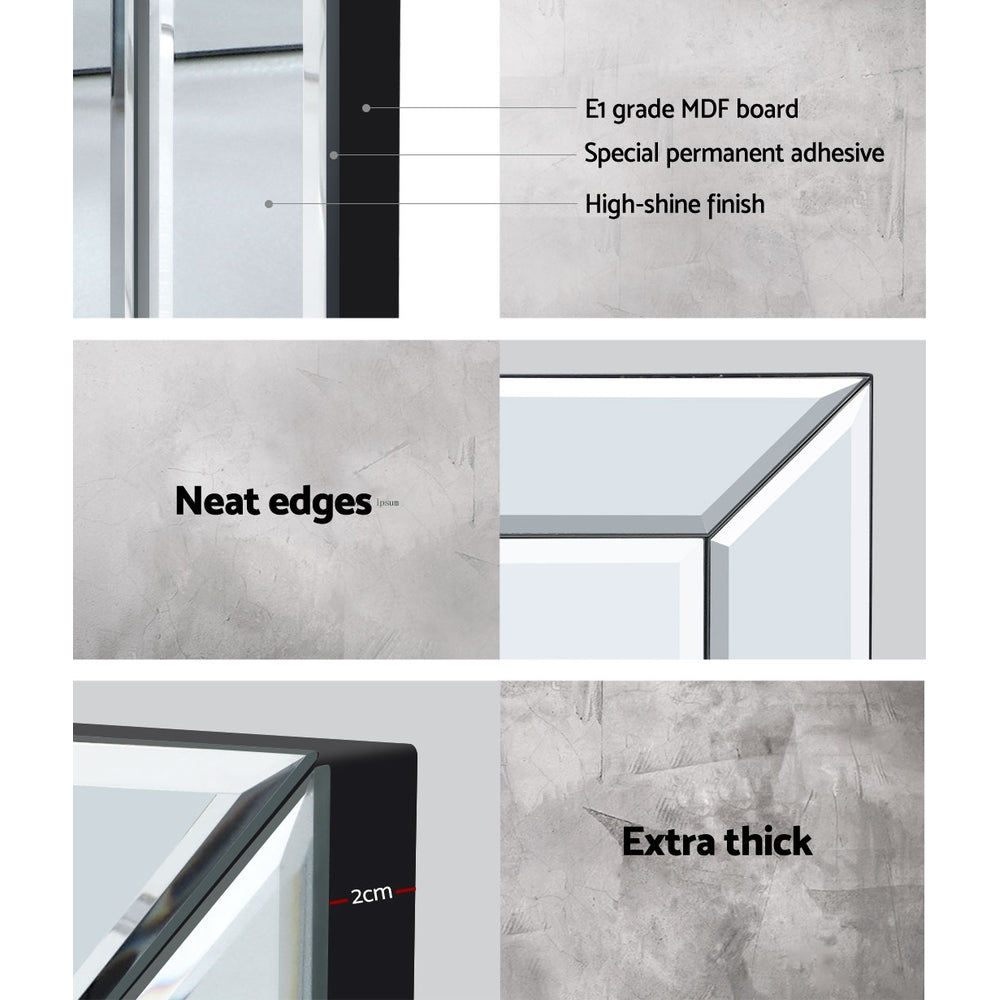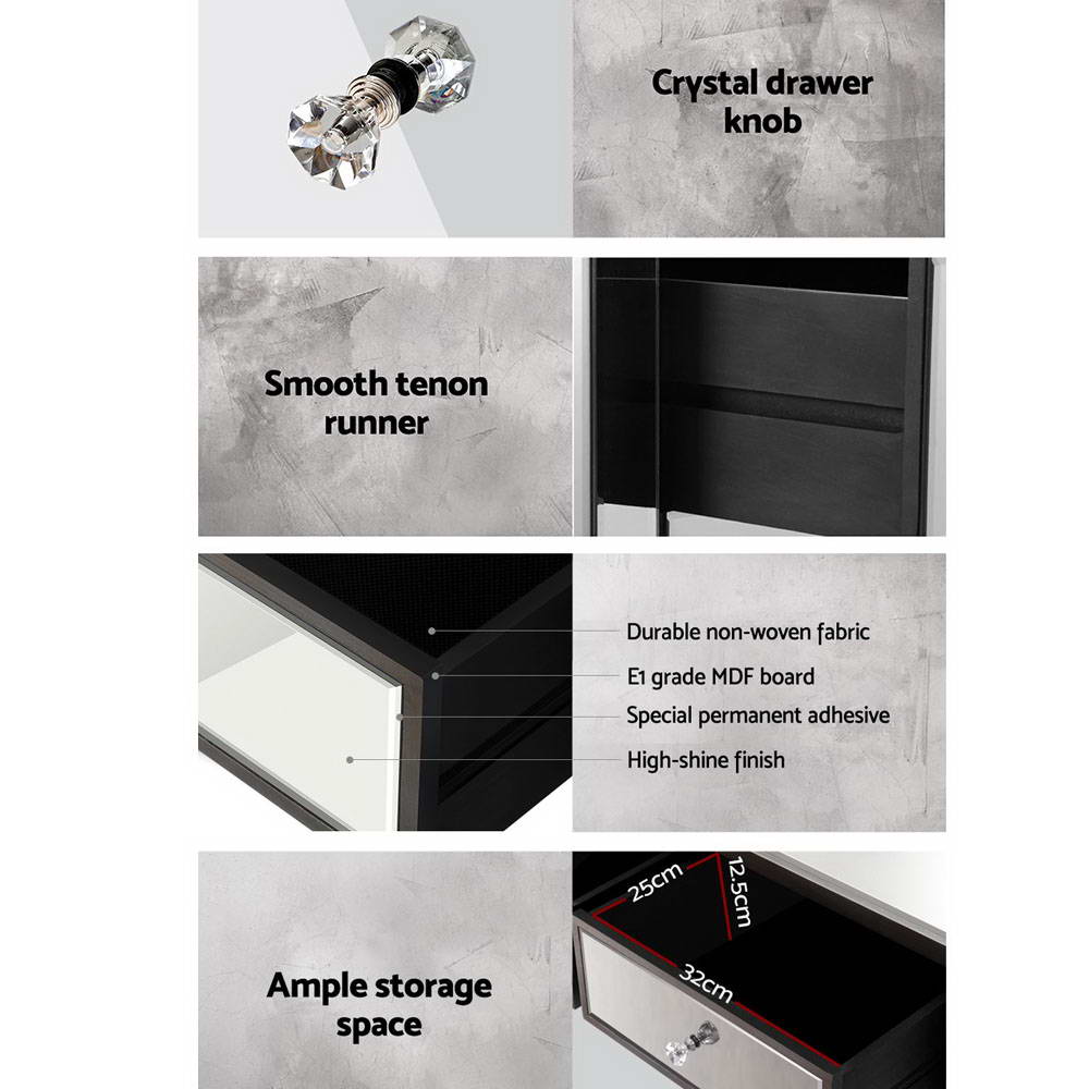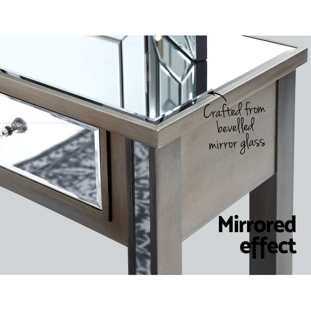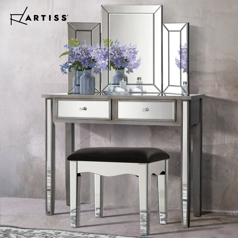 Enjoy all the glitz and glamour that comes with our Mirror Dressing Table set that comprises a table, mirror and stool. Cladded with bevelled mirror glass and a durable E1 grade MDF board frame, the elegant dressing table set is simply stunning from any angle that reflects its mirrored beauty. And the mirrored effect gives your bedroom a larger-than-life look of space and size. The large tabletop is 32cm wide and there are two drawers fitted with smooth runners, so you have ample space to display or store your items. The crystal glass effect handles also add a scintillating touch to the drawers with an exquisite appeal. The folding mirror is sturdy, at 2cm thick with safety brackets included. The side mirrors fold 180° so that you can admire your reflection from any angle or completely close the mirror when not in use. The stool is upholstered in premium PU leather and padded with thick foam for luxurious comfort. Easy to maintain and clean, our dressing table is all about grandeur living made simple.