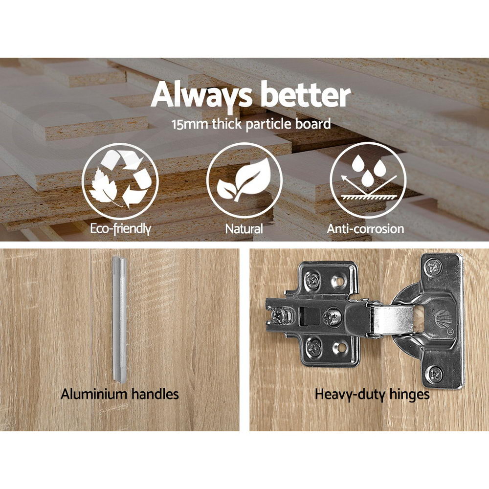 Featuring a durable 15mm thick particle board and MDF construction with melamine finish, our Wardrobe is a stylish addition to any home. The wardrobe has ample storage space with a large double-door compartment and one single-door full-length compartment (with aluminium hanging rails included for both) for all your tall clothing such as coats and dresses, and two spacious drawers on the bottom for other smaller pieces of clothing and fashion accessories. It has a simple and modern design with sleek aluminium handles that will blend in easily with the décor of your bedroom or dressing room. The wardrobe also features horizontal backboards for extra support, anti-rust drawer runners, heavy-duty hinges and anti-slip base so that it will last for many years to come. Wall-mounting accessories come included for extra security and stability.