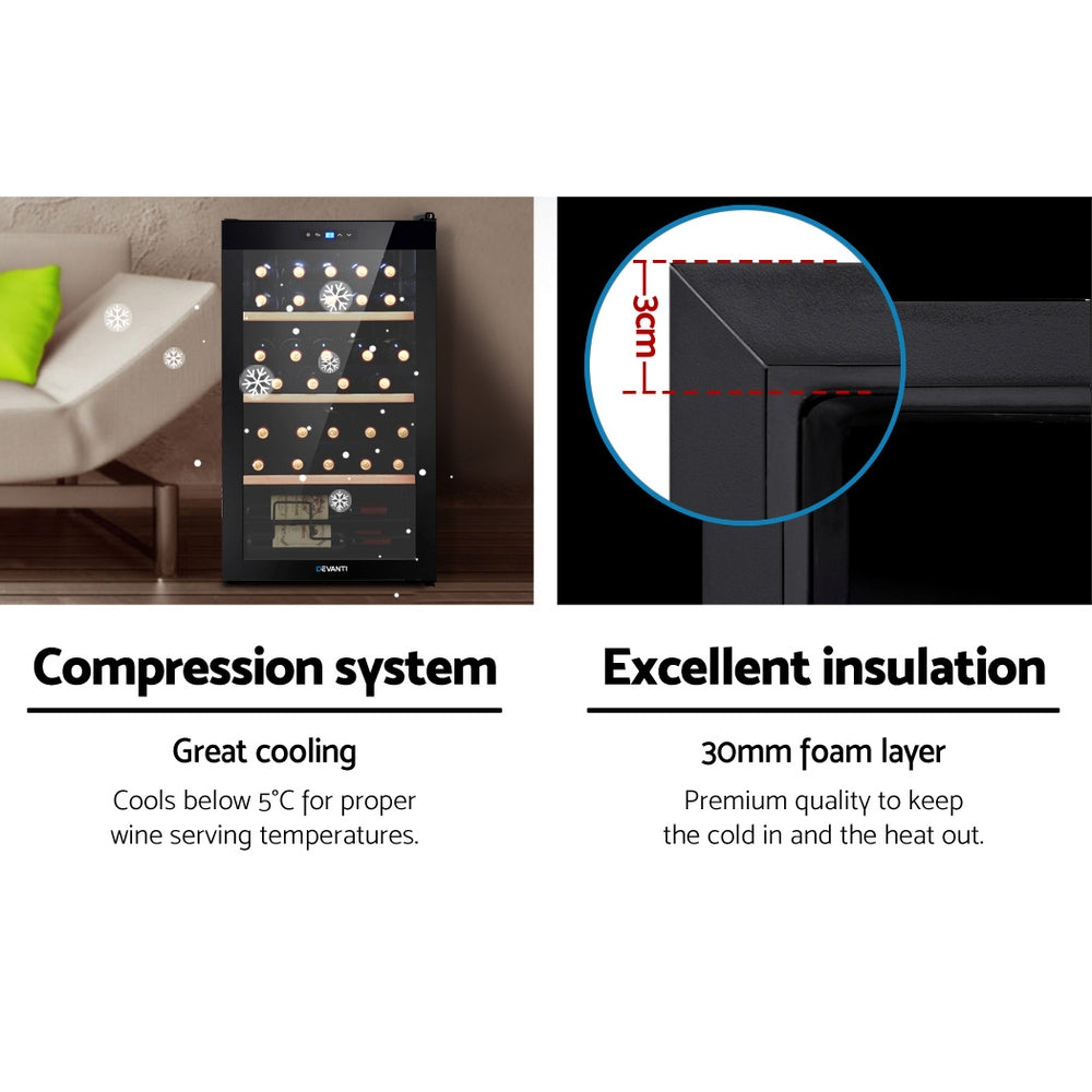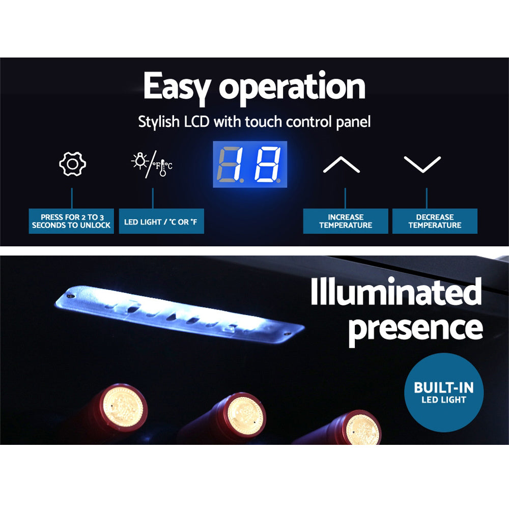 Need a good and reliable wine cooler? Look no further than our Devanti Wine Cooler. Utilising the latest high precision compression cooling technology, our wine cooler ensures your favourite vintages are well kept at their prescribed temperatures with its circulated cool air. The touch control panel makes for easy adjustments with temperature control and the built-in interior LED light helps you to see your wines in the best light. The stylish and compact design stores up to 34 bottles of wine in a neat and tidy shelving system. The shelves are removable to allow for changing the layout according to the contents and for easy cleaning as well. Better still, the double-glazed glass door is UV-resistant and provides excellent insulation along with the 30mm thick foam wall. The ensemble works quietly and efficiently and has a handy child-lock on its control panel for total peace of mind.