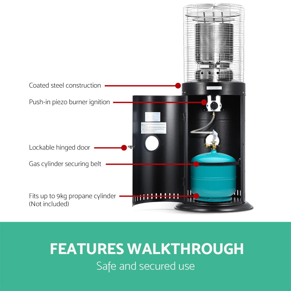 Safety wise, the Devanti Gas Patio Heater ensures that every part of it can be operated with total peace of mind. A 9kg gas cylinder is safely and securely stowed inside the base with securing belts. Other great features include push-in piezo burner ignition, two heat settings, lockable hinged door, flame guard and a smart Oxygen Depletion System that senses oxygen levels and switches off the entire ensemble when oxygen levels are low.