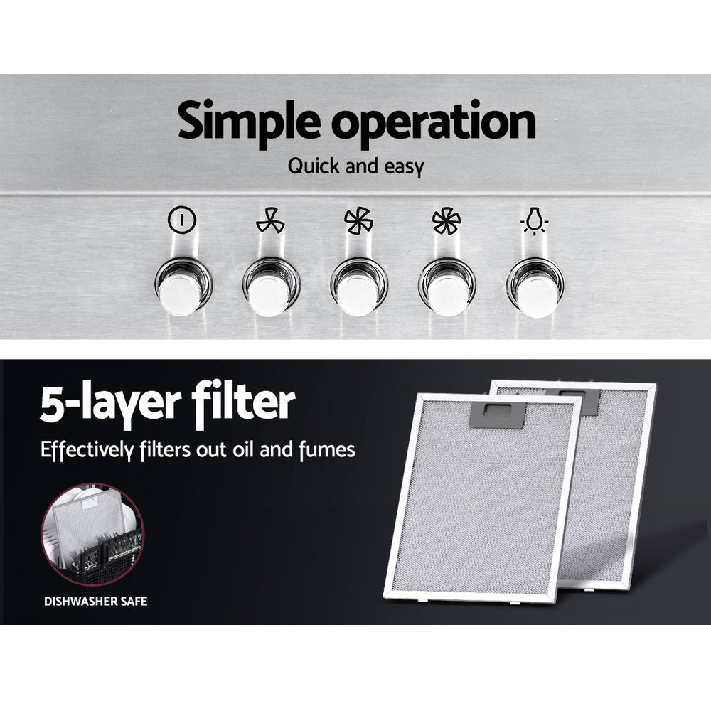 Say goodbye to smoky fumes and unwelcome cooking odours with the Devanti Range Hood. With its high-performance motors, the brushed stainless steel range hood provides a steady upflow and filtered extraction of fumes and oil to keep your cooktop area clean and fresh after every use. With its 3-speed rocker button switches, the extraction speed can be adjusted to suit the circumstances. Other features include two non-stick 5-layer aluminium filters that are removable and replaceable and bright LED lighting to facilitate your illuminated cooking. The range hood is wall mounted and the chimney can be adjusted to fit the installation space.