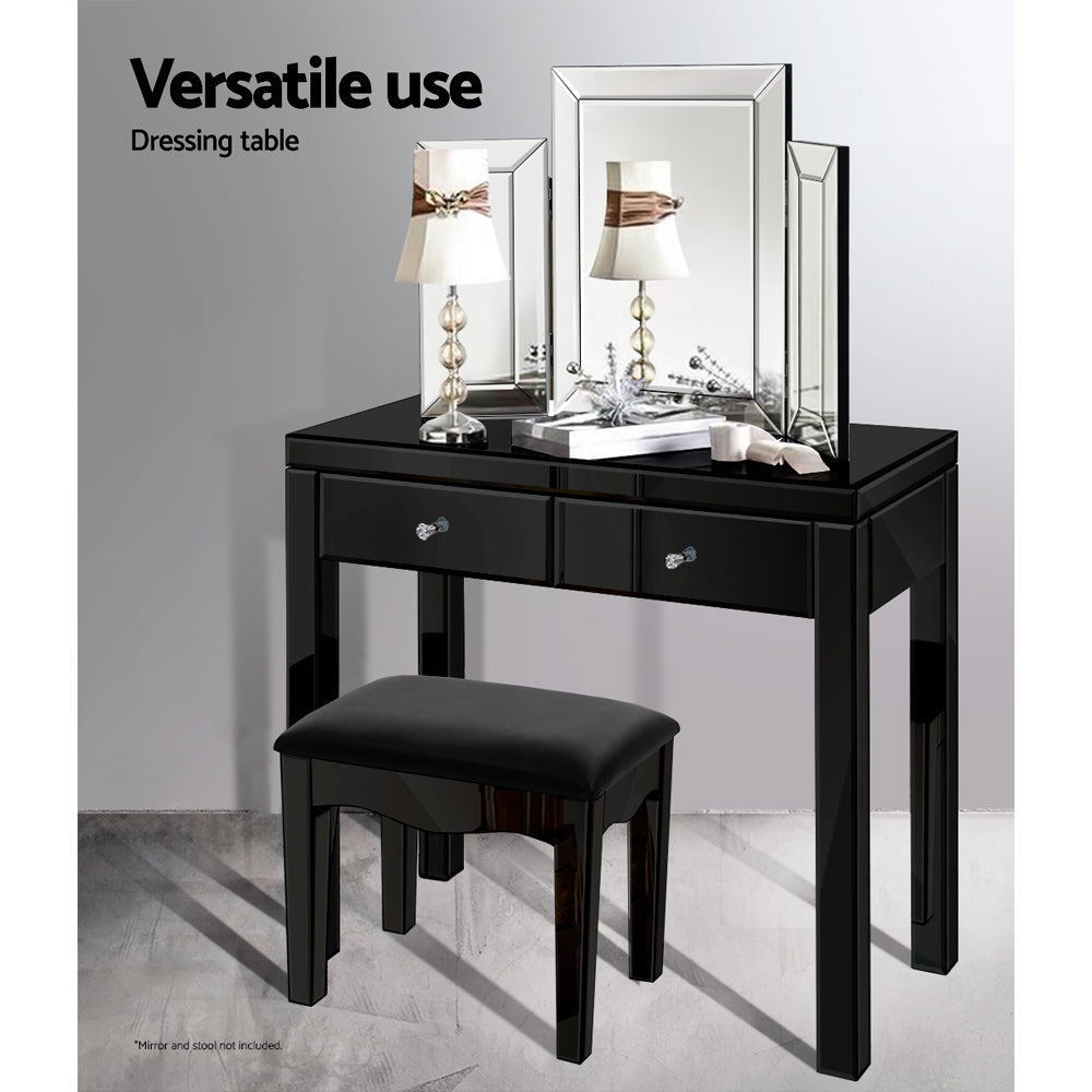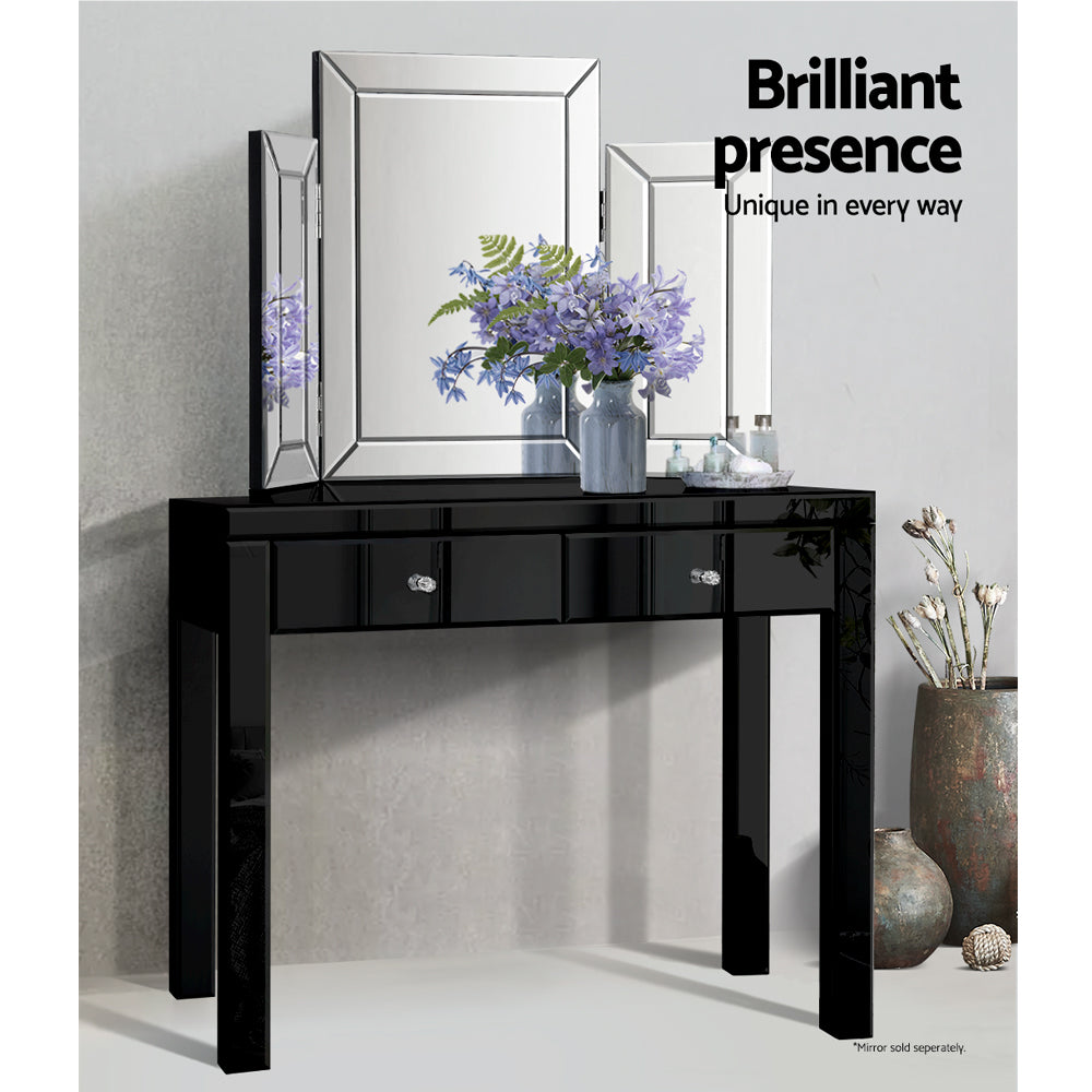 Enjoy all the glitz and glamour that comes with the Mirror Console Table, with sleek black mirror effects. Cladded with bevelled black-back glass and constructed with durable E1-grade MDF, the elegant table is simply stunning from any angle. Place the console table at your entryway to make a grand entrance and wow your guests or mount a mirror on top and place in your bedroom to transform the console table into a dressing table. The large tabletop is 40cm deep and there are two drawers fitted with smooth runners, so you have ample space to display or store your items. Not least, the crystal glass effect handles also add a scintillating touch to the drawers with an exquisite appeal. Easy to maintain and clean, our console table is all about grandeur living made simple.