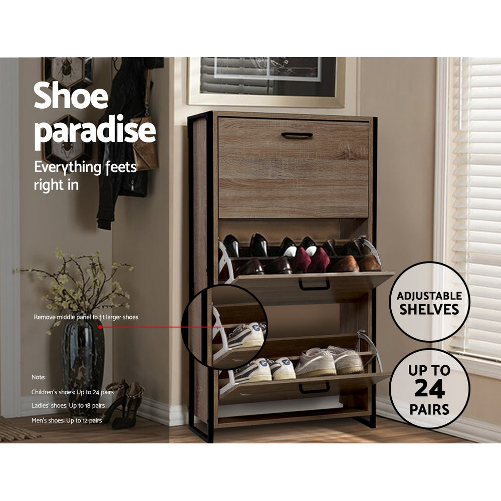 You are shoe proud. That is why you need ample space for all that wonderful footwear. Organise and save your floor space with our Shoe Cabinet and have a clutter-free entrance at all times. The three storage compartments are pull-down for easy access and have adjustable shelves so that they can fit different footwear of all shapes and sizes. In fact, up to 24 of your favourite pairs would fit comfortably in it. Solidly constructed with metal side frames, thick particle board and smooth paper veneer finish, the shoe cabinet is strong and durable to withstand daily robust use. Not least, the eclectic industrial design with beautiful black vintage-style handles definitely lends a touch of elegance to any home.