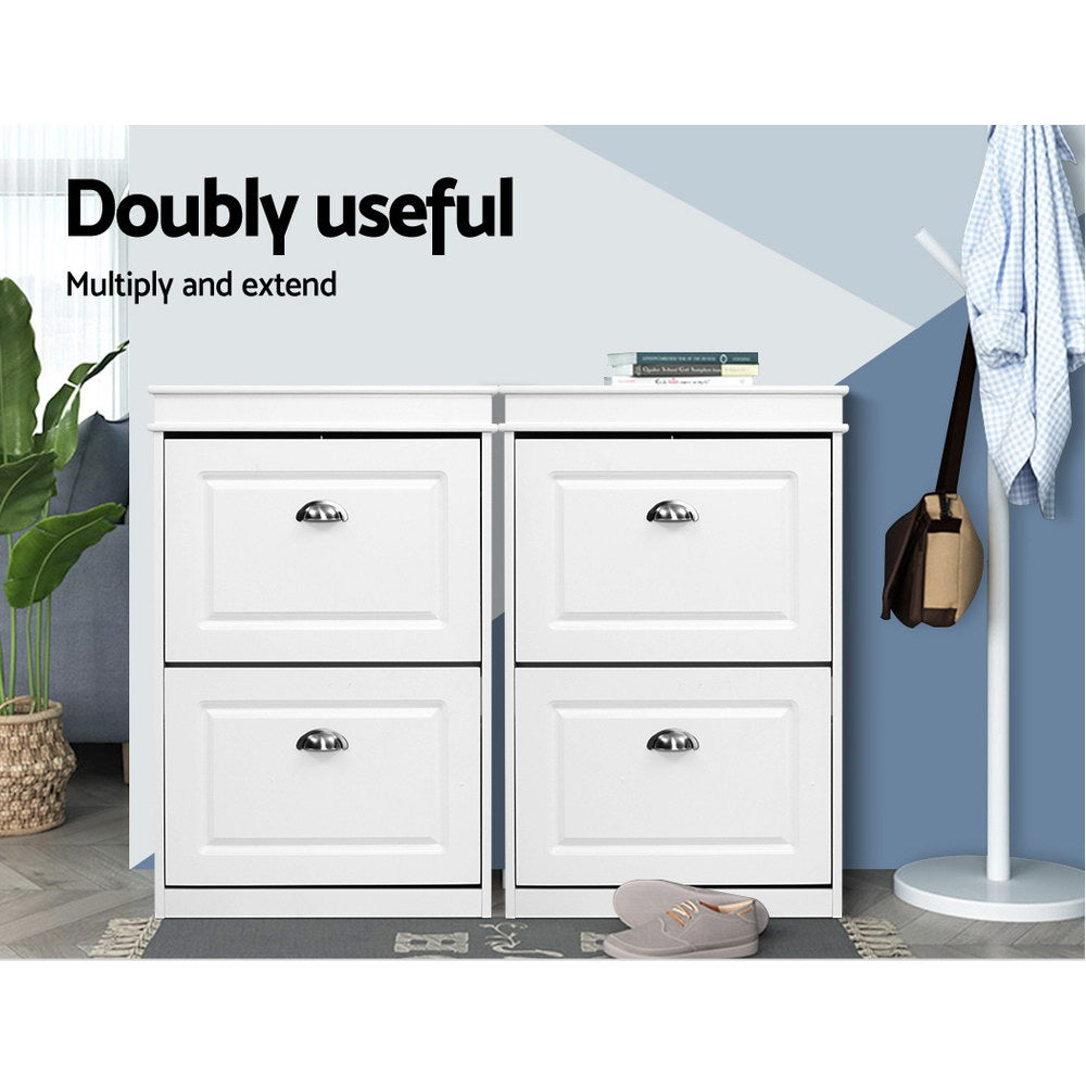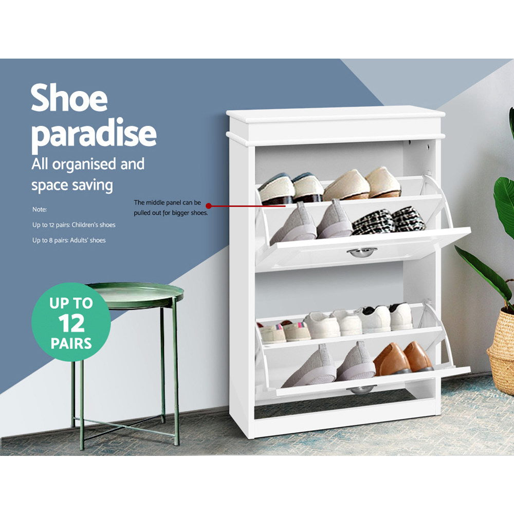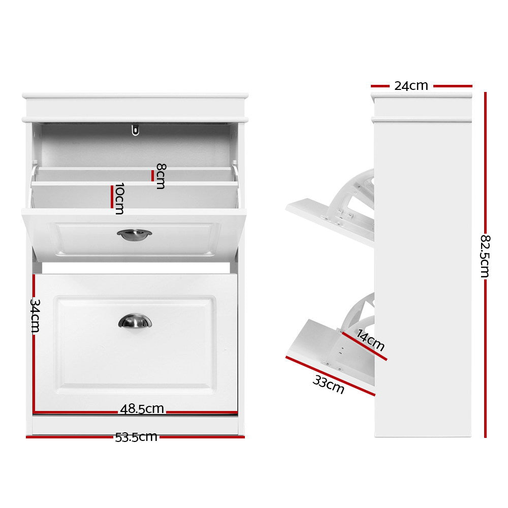 You are shoe proud. That is why you need ample space for all that wonderful footwear. Organise and save your floor space with our Shoe Cabinet and have a clutter-free entrance at all times. The two storage compartments are pull-down for easy access and have two tiers of adjustable shelves so that they can fit different footwear of various shapes and sizes. In fact, up to 12 of your favourite pairs would fit comfortably in it. Made of premium E1 MDF with smooth NC lacquer finish, the shoe cabinet is strong and durable to withstand daily robust use. Not least, the classic design, with beautiful retro-style metal cup pull handles, definitely lends a touch of elegance to any home.