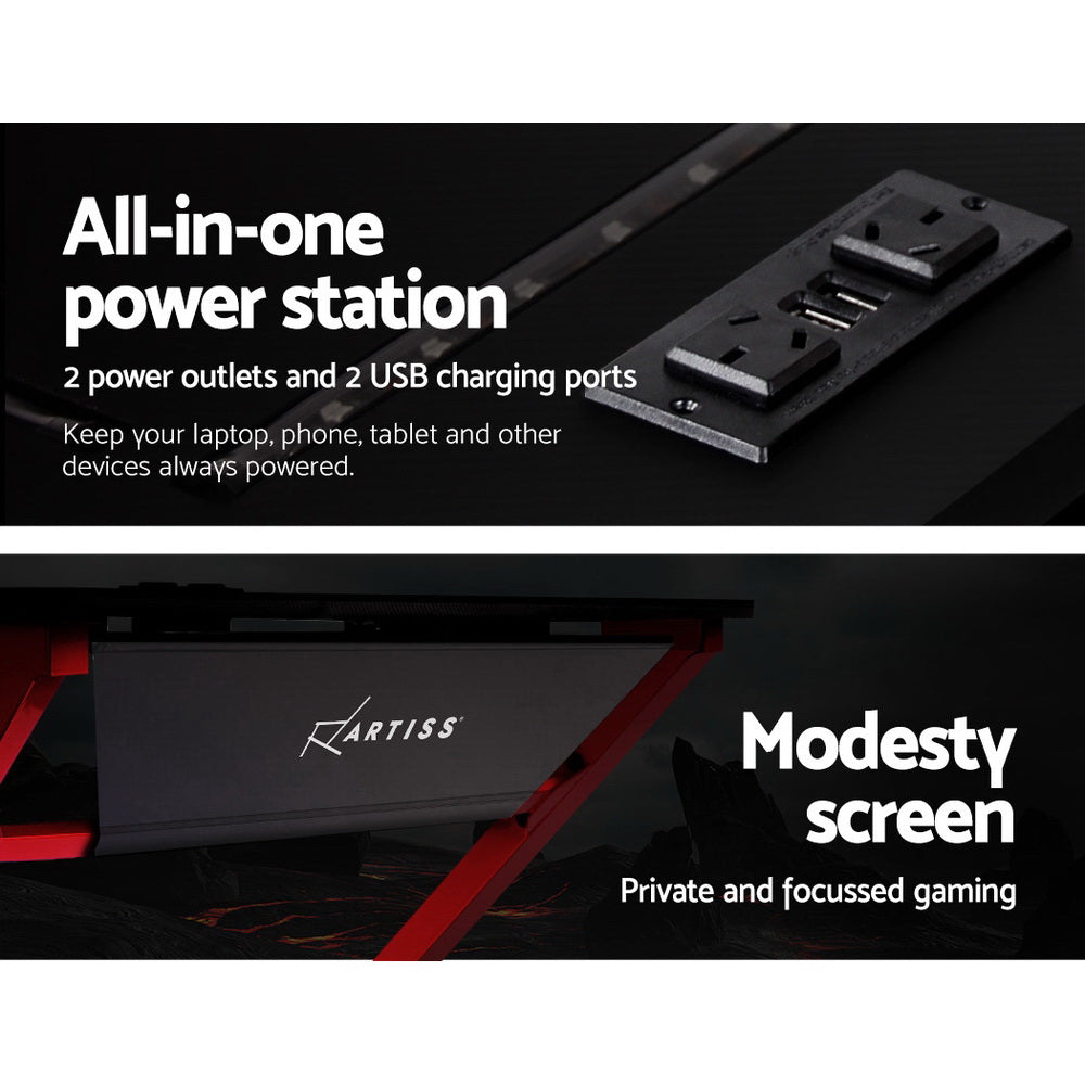 If you are an enthusiastic gamer, our Gaming Desk will be the perfect addition to your gaming setup. This upgraded model even has built-in 7-colour LED light strips that can be customised with the included remote control, to go with the multicoloured lighting of your gaming keyboard and mouse. The wide desk surface is large enough to accommodate all your gaming gear and is strongly supported by the powder-coated steel frame with Z-shaped legs. The desktop is contoured to fit and curve around your body so that you are always close to the action happening onscreen. The smooth carbon fibre textured surface ensures that you always feel comfortable by reducing fatigue to your wrists. A modesty screen also comes included to help you completely focus on your gameplay and not be influenced by outside factors. There is a built-in cable management system at the back of the desk to keep all your cables tidy, and also an all-in-one power station with two power outlets and two USB charging ports to keep all your various devices powered. Create your own gaming arena at home with our gaming desk for the perfect gaming experience.