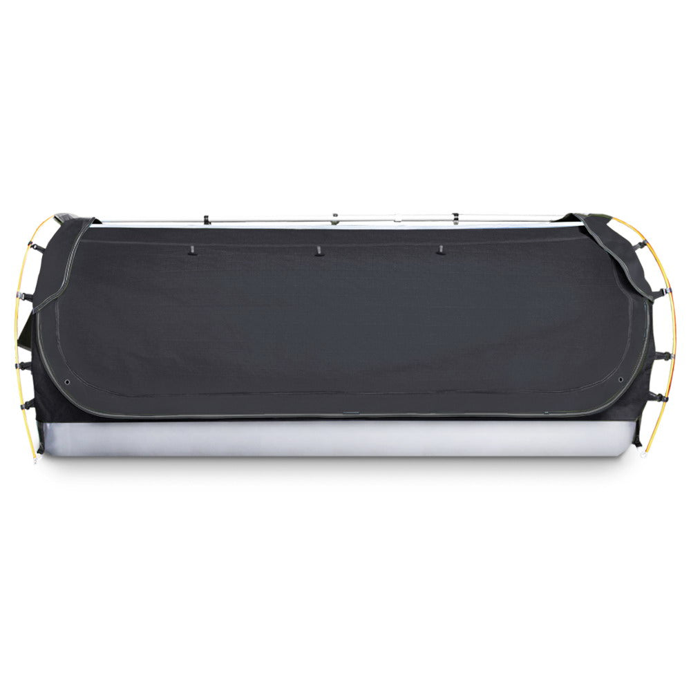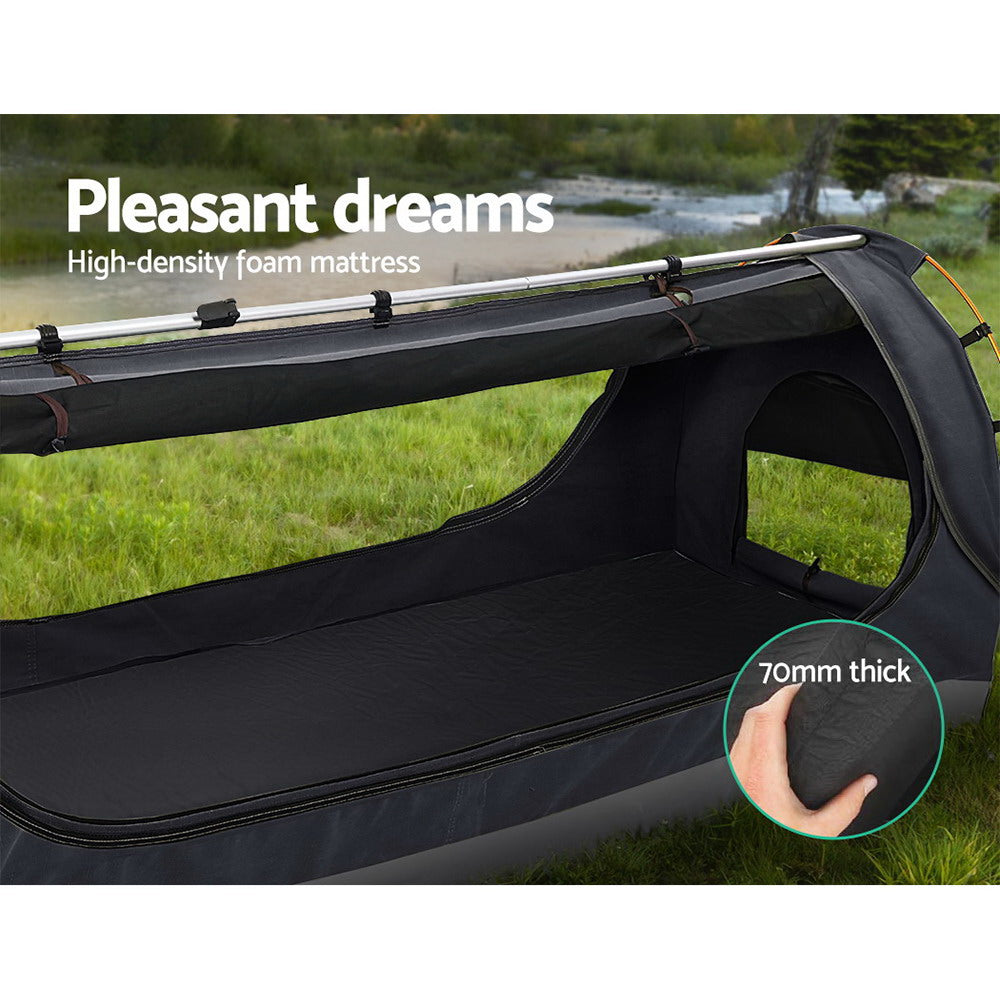 A 14oz 400gsm water-repellent Rip stop canvas cover, 500gsm PVC flooring and an extra 10cm high edge all round. Swagspeak for the ultimate tear-resistant waterproofing. Fully enclosed for privacy with zipped openings for fresh air anytime. Mesh panels to keep insects out. A 70mm high density foam mattress for better sleep on any surface. Thick aluminium support poles to hold up the entire set up.