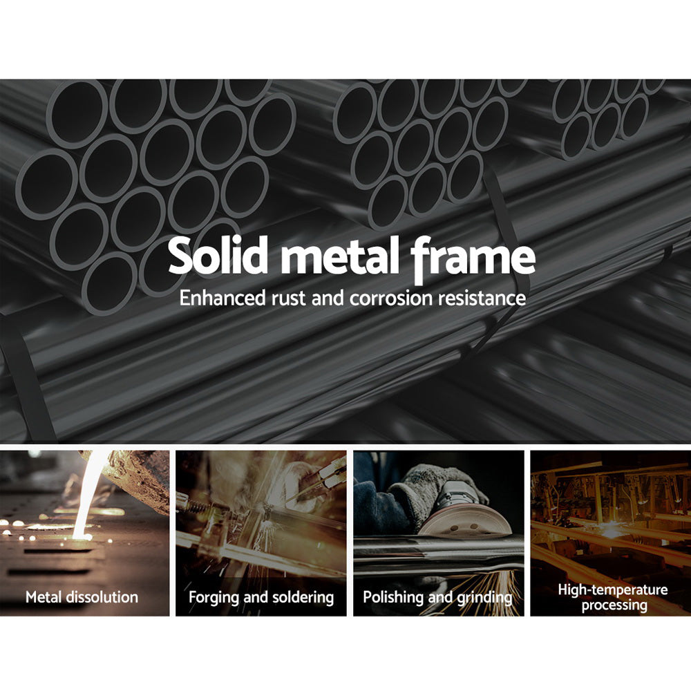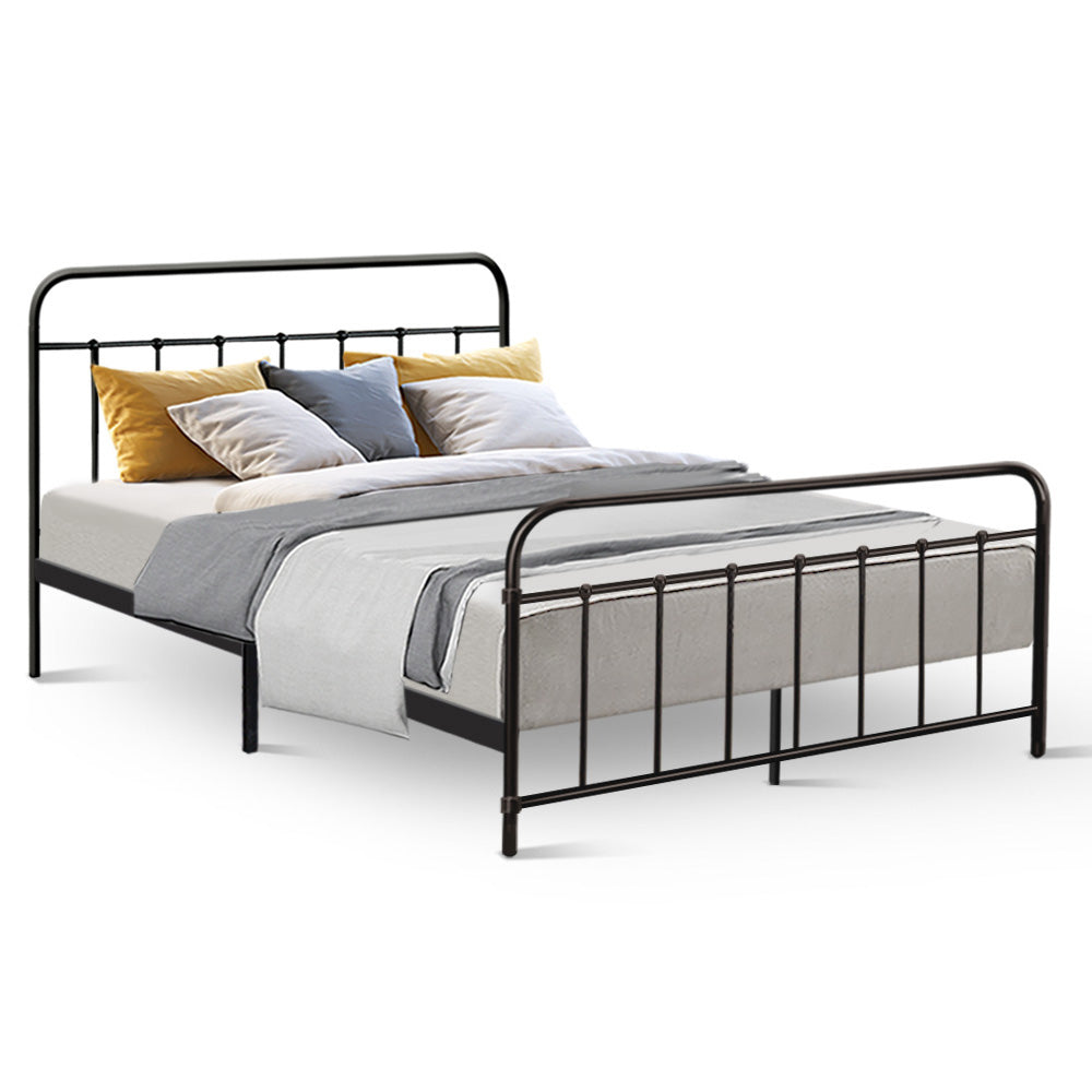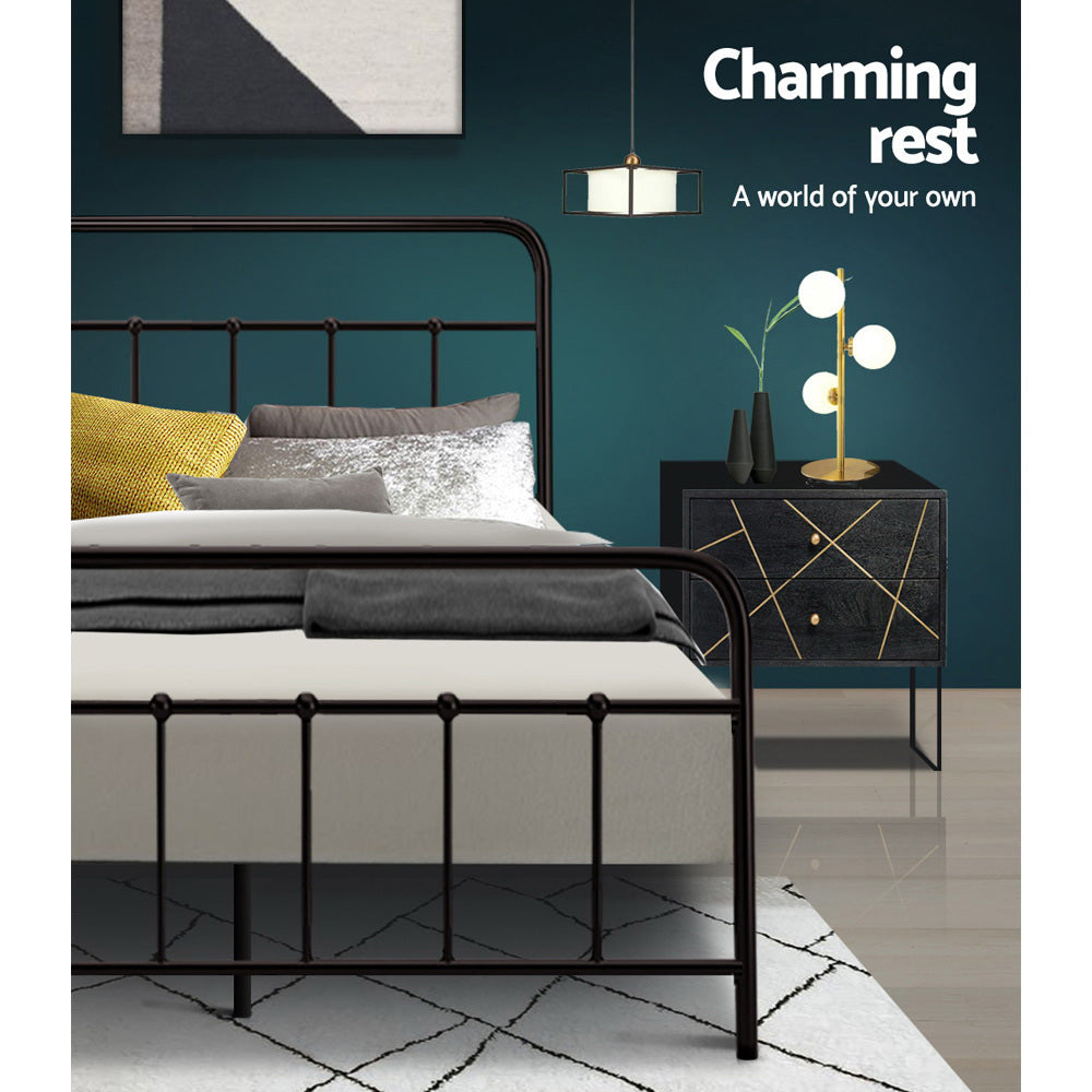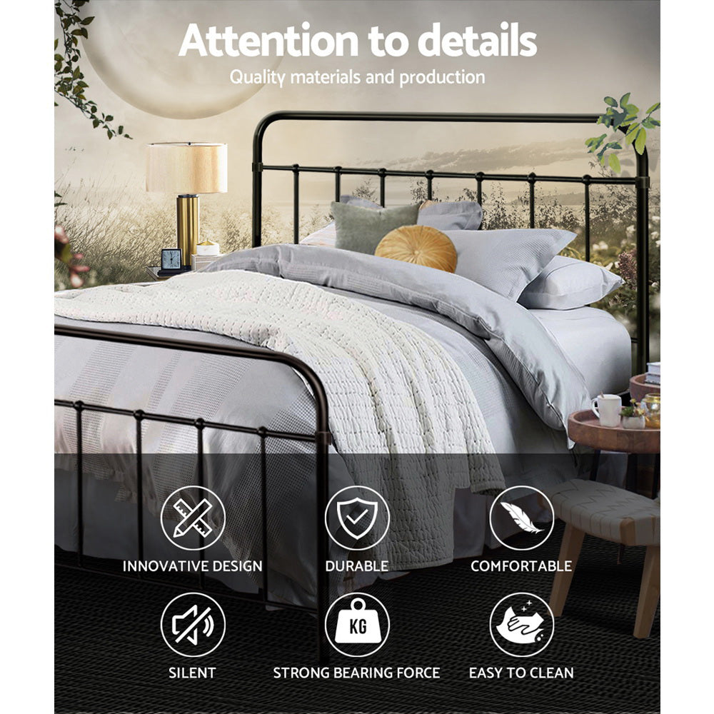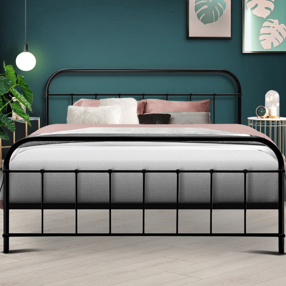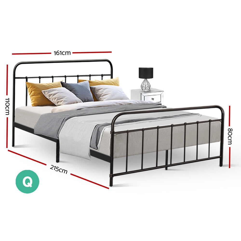 Simple in design, our Metal Bed Frame is constructed in sturdy steel for durability and strength. The modernistic headboard and tailboard feature a matte black slat-design that is both timeless and practical. And the rust-resistant black powder-coated finish lends a sophisticated yet neutral look that will go well with any room decor.